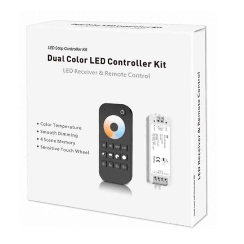 The SC-KIT-CTT is a dual-channel LED control kit designed to manage adjustable color temperature (CCT) LED strips with great precision and convenience. Consisting of a compact controller (model V2) and an RF remote control (model RT2), it allows continuous color and brightness adjustment using an ultra-sensitive touch wheel, without flickering or interruptions. It supports an output power of up to 120W per channel (at 24VDC) and offers advanced features such as 4-scene memory, auto-transmission of signal up to 30 meters between controllers, and automatic synchronization of multiple units. It has a constant voltage output (12-24VDC), with 2000Hz PWM control for linear and precise lighting adjustment. It includes reverse polarity protection and is CE, EMC, LVD, and RED certified. The kit is designed for indoor use (IP20) and is ideal for decorative, commercial, or residential lighting applications where efficient color temperature management is required.