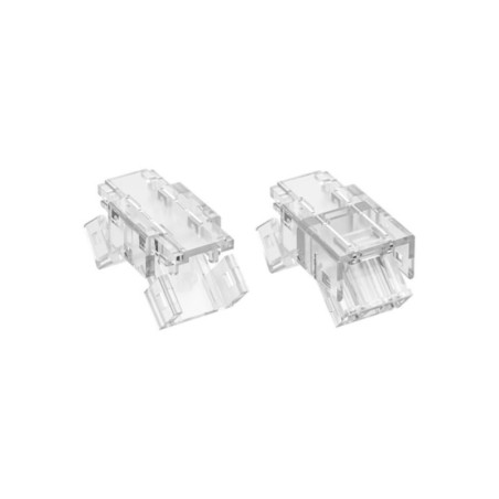 Hippo-M MAX straight 8mm connector, model MX2045-X8C-2P , ideal for COB and SMD LED strips. Strip to Strip Joint type, without cable. Constructed with transparent polycarbonate (PC) housing and nickel-plated phosphor bronze contacts for a secure connection. Supported voltage DC3~24V , maximum current 5.5A , and compatibility with strips of thickness 0.25~0.35mm.
