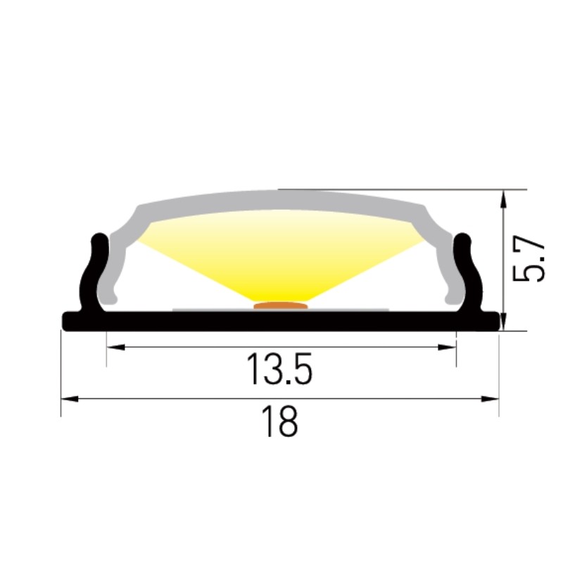 Flexible aluminum profile for commercial and decorative interior lighting. Its slim, bendable design allows for custom shapes, making it ideal for applications requiring adaptable and creative installations. Made of aluminum with an anodized finish, it is compatible with LED strips up to 13 mm thick. Dimensions: 2000 mm (length) x 18 mm (width) x 6 mm (height). 3-year warranty.