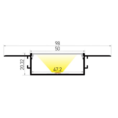 Recessed aluminum profile for commercial and decorative interior lighting. Made of aluminum with an anodized finish. Compatible with LED strips up to 47 mm and featuring an elegant design that allows for discreet integration into any space.