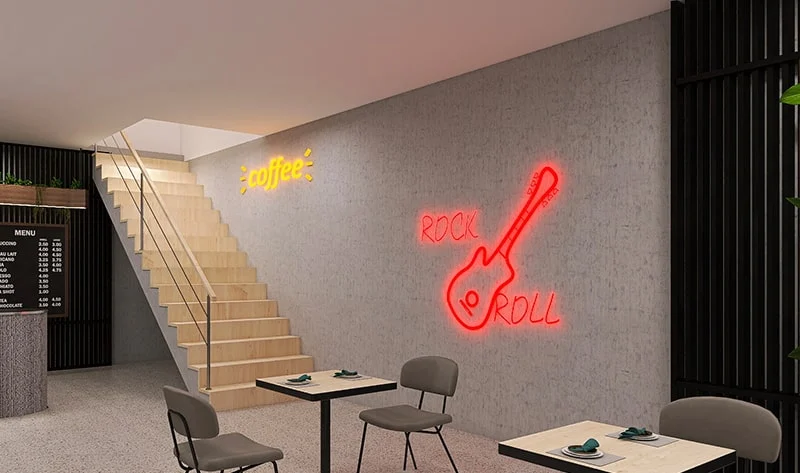 - Restaurantes y Cafeterías: La flexibilidad de diseño permite la creación de letreros de neón personalizados que reflejen la marca y creen un ambiente único y acogedor en restaurantes y cafeterías.
