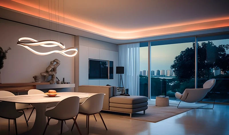 El aspecto estético no se queda atrás en las tendencias de iluminación LED. El uso de tiras LED y luces empotradas no solo proporciona una fuente de luz funcional, sino que también destaca elementos arquitectónicos, obras de arte o muebles, agregando un toque decorativo significativo al salón. Las luminarias decorativas y lámparas colgantes han ganado popularidad al actuar como piezas de declaración que complementan y elevan el diseño general del espacio.