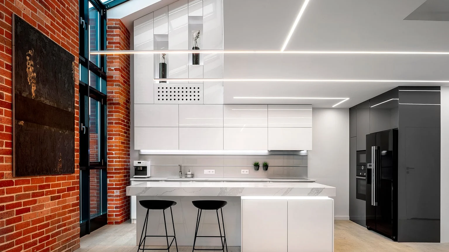 Discreción y Estética Minimalista: La iluminación integrada y oculta se caracteriza por su capacidad para fundirse de manera discreta con la arquitectura y los elementos de diseño de la cocina. Las fuentes de luz se incorporan en elementos estructurales, como techos, estantes o incluso muebles, proporcionando una iluminación efectiva sin interrumpir la estética general con accesorios visibles.