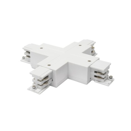 Conector en cruz ""+"" para unir cuatro secciones de carril electrificado de 220V en una configuración central.