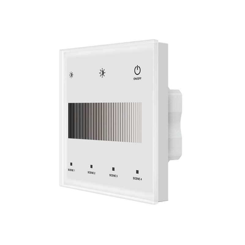 El TD1-S es un elegante panel táctil de pared diseñado para el control de iluminación monocromática (blanco) mediante el protocolo DALI, ideal para aplicaciones simples de encendido, apagado y regulación de intensidad. Compatible con el estándar DALI DT6, permite controlar luminarias a través de un panel táctil de vidrio templado blanco con una interfaz intuitiva y retroiluminación LED. Funciona en modos unicast, grupo y broadcast, y puede alimentarse directamente desde el bus DALI o mediante una fuente externa de 24?VDC. Su diseño sin control por zonas lo convierte en una solución práctica para espacios individuales como oficinas, viviendas o tiendas. Además, incorpora conectividad inalámbrica 2.4?GHz, lo que lo hace compatible con mandos remotos de la misma frecuencia. Con dimensiones de 86 × 86 × 34,5 mm y montaje en caja estándar, el TD1-S ofrece una combinación de funcionalidad y estética para instalaciones modernas de iluminación LED monocromo.