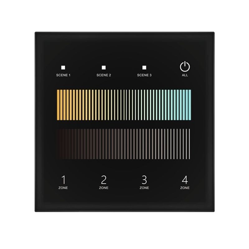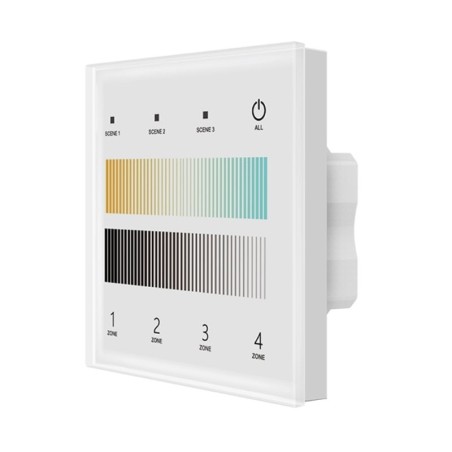 El TD2-4S es un elegante panel táctil de pared diseñado para el control de iluminación DALI de blanco dinámico (Tunable White). Con capacidad para gestionar hasta 4 zonas independientes, permite ajustar tanto la intensidad como la temperatura de color de las luminarias compatibles gracias a su deslizador táctil y botones retroiluminados. Es compatible con el protocolo DALI estándar (IEC 62386-102, -207, -209) y admite regulación DT8. La alimentación puede realizarse directamente a través del bus DALI o mediante una fuente de 24?VDC. El direccionamiento de las luminarias se configura mediante interruptores giratorios en la parte posterior, ofreciendo modos unicast, grupo y broadcast. Además, incorpora conectividad 2.4?GHz para control inalámbrico mediante mando remoto, lo que lo convierte en una solución versátil y moderna. Su diseño en cristal templado blanco, sus dimensiones estándar de 86?×?86?×?34,5?mm y su interfaz intuitiva lo hacen ideal para entornos residenciales, comerciales o arquitectónicos donde se busque comodidad y estética en el control de luz blanca dinámica.